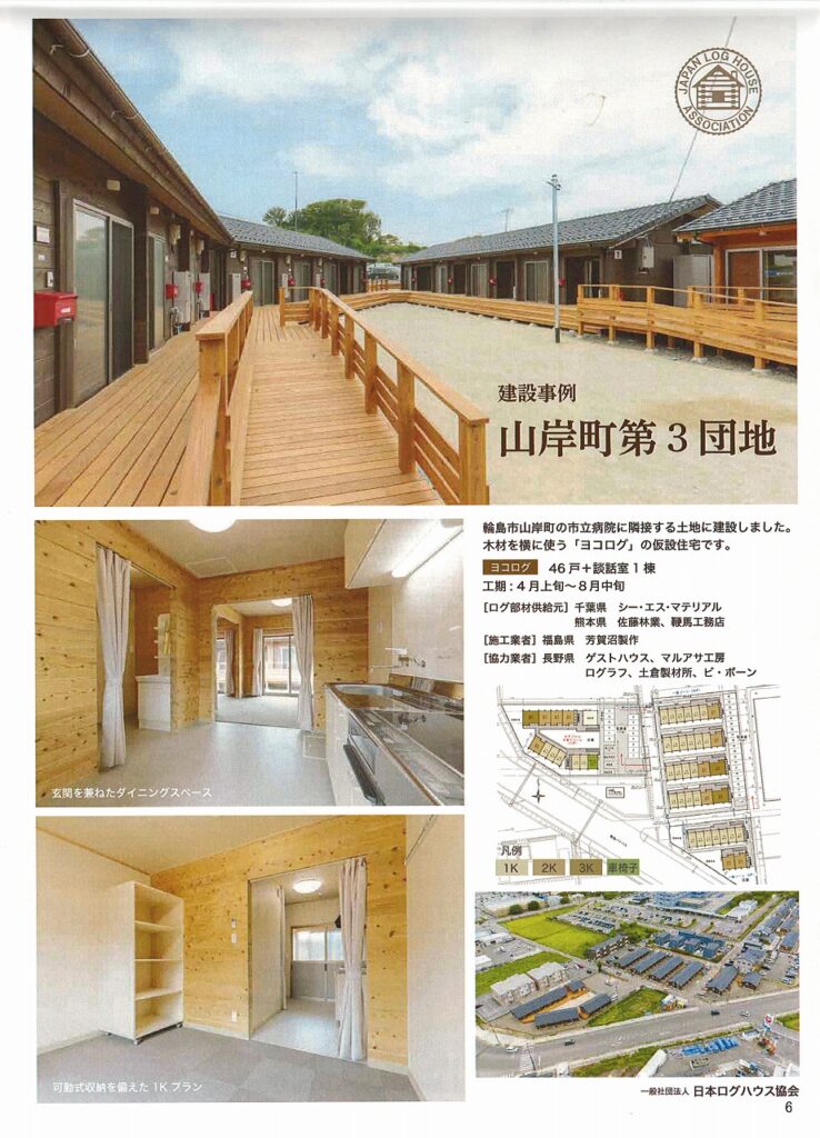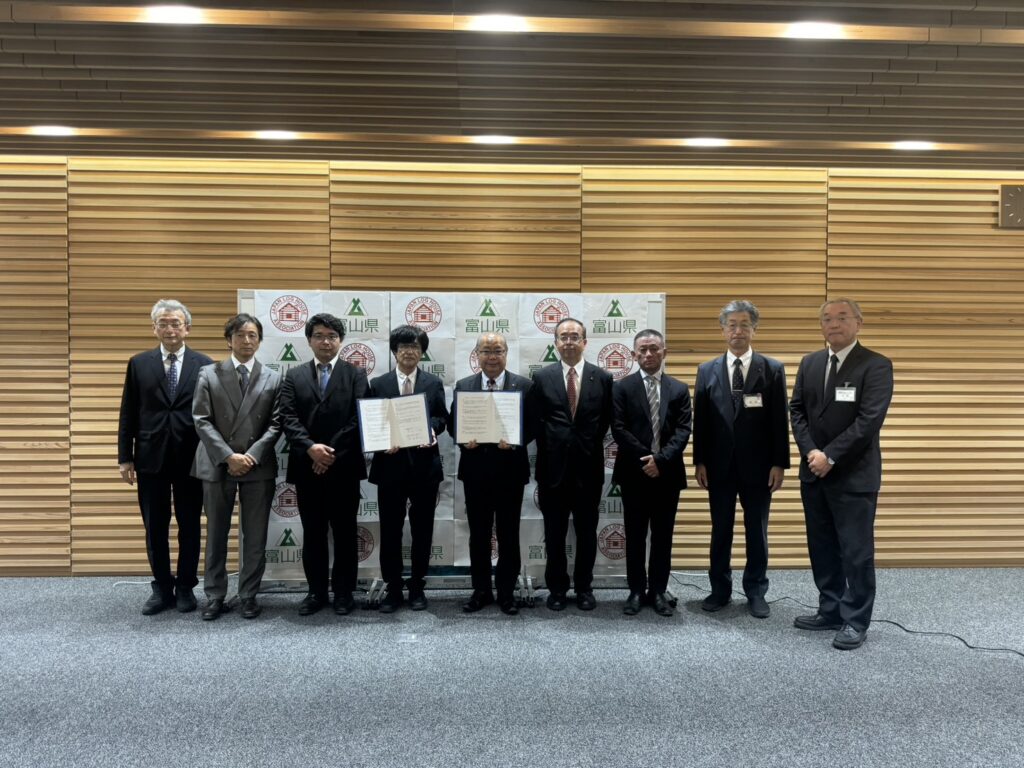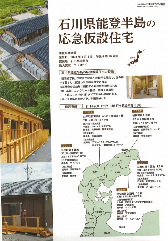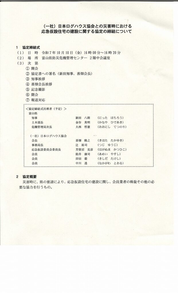富山県庁にて、日本ログハウス協会と富山県が災害時の応急仮設住宅建設に関する協定を結びました。当社を含む県内3社を中心とした全国108社の会員企業が、被災者が身を寄せる仮設住宅建設に協力するという協定です。県防災危機管理センターで締結式があり、新田知事とログハウス協会喜畑会長が出席しました。知事は「仮設住宅建設体制の更なる強化につながる」喜畑会長は「有事の際は県産材を使って作りたい」と、其々述べられました。同協会は、東日本大震災で福島県に585戸、能登半島地震で石川県に146戸の応急仮設住宅を設けました